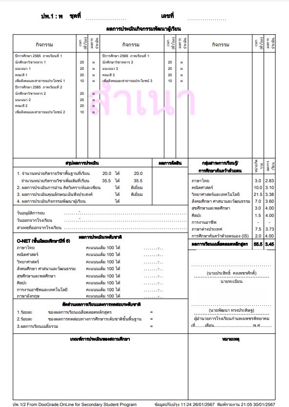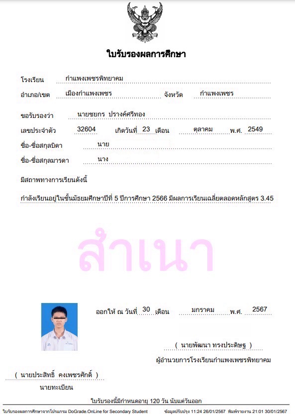 เอกสารแสดงว่ากำลังศึกษาหรือจบการศึกษา ปพ.1 "ด้านหน้า" หรือ ใบรับรองผลการเรียน ที่แสดงผลการเรียน (ปพ.7)